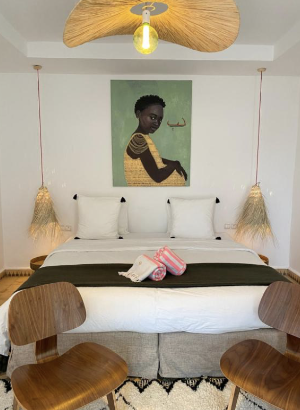 Les couleurs chaudes dialoguent avec quelques œuvres d’artistes africains, au trait naïf, rappelant ces toiles vibrantes que l’on découvre au détour des souks.