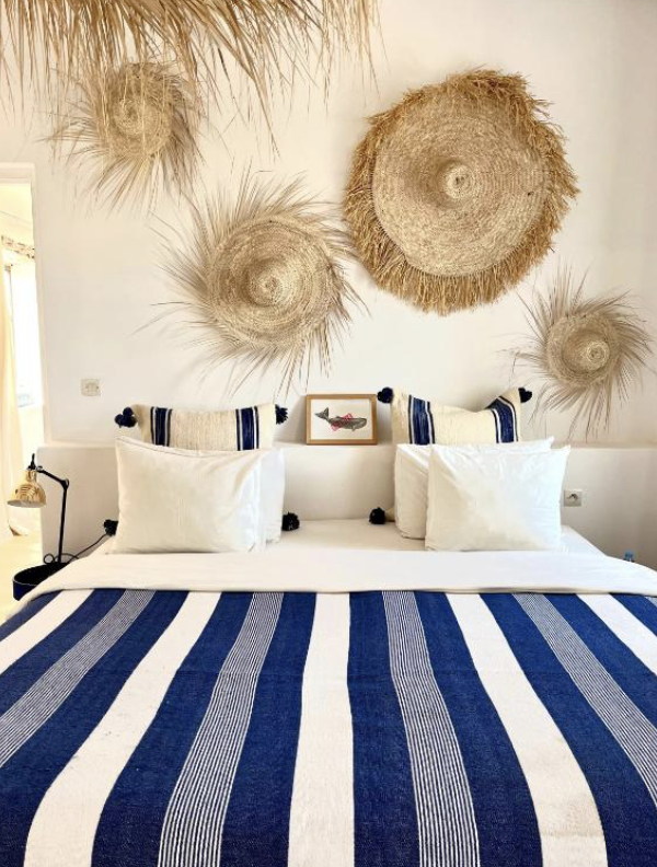 Au pied du lit, le feu de bois exauce les envies de romance, tandis que les touches de bleu pastel rendent hommage à l’univers d’Yves Saint Laurent, pour qui le Maroc fut “m’a donné les couleurs”.